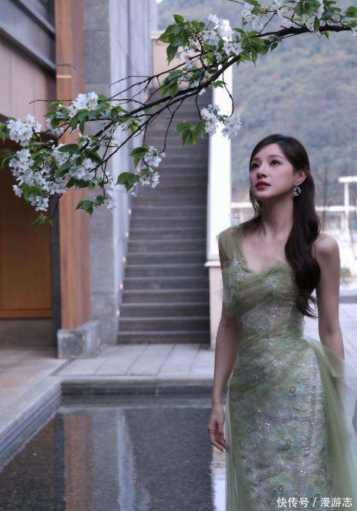 动态内容是她在林芝欣赏桃花的照片,一袭淡绿色的长裙与美景相得益彰。